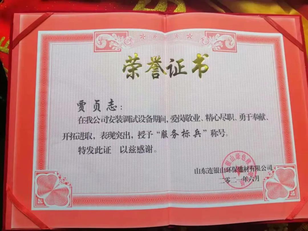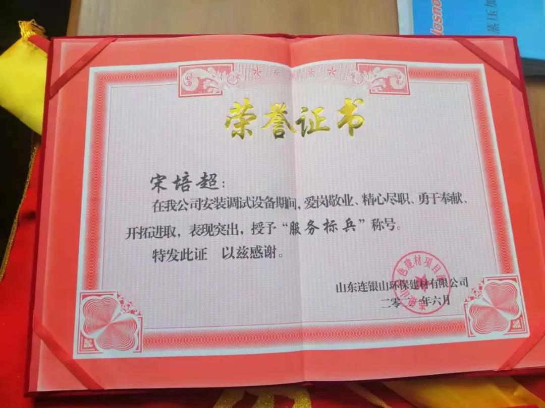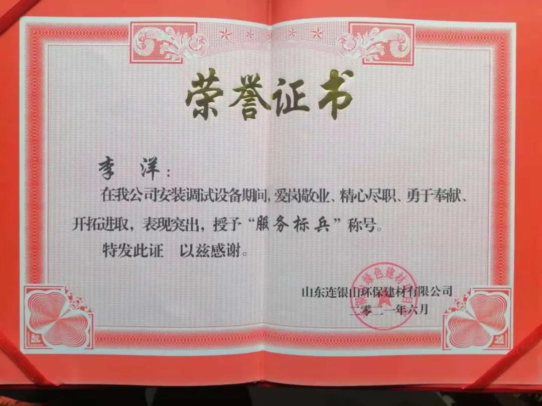 炎炎夏日,天意机械在向客户山东连银山环保建材有限公司售出保温装饰一体化板生产线之后,随即派出售后团队对设备进行安装调试及售后培训。售后团队不畏酷暑,精心、耐心、专业地为客户进行安装调试,赢得了客户的好评和认可,客户为表达谢意,特授予天意机械售后人员荣誉证书和锦旗,以表彰售后人员爱岗敬业、精心尽职、勇于奉献、开拓进取的精神。