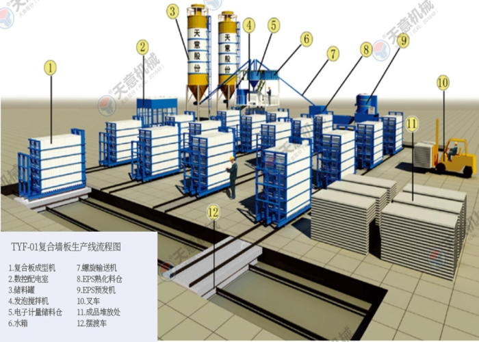 TYF-01型立式复合墙板生产线,设备占地面积小,产品一次成型,产量高。主机配有自动行走系统,设备运转更简单快捷,大型固定式搅拌设备,搅拌料浆更均匀,浇注效率更高。